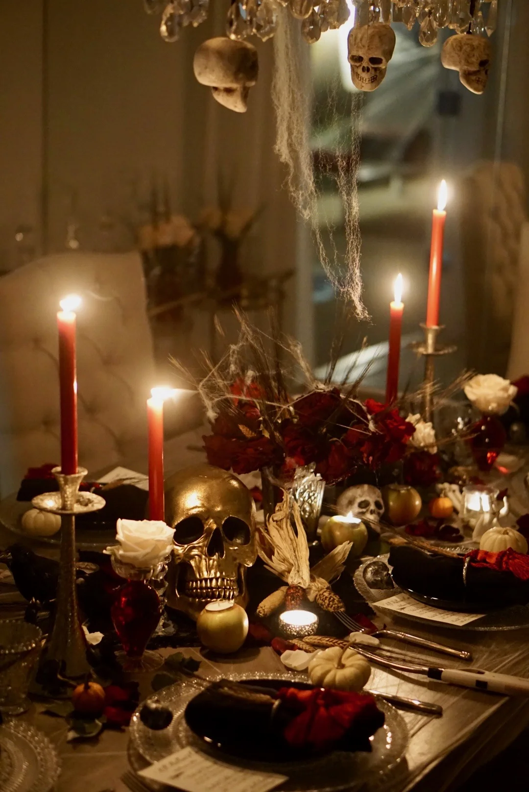 Color. I don’t go for the traditional black & orange décor but, instead, opt for gold and silver metallics, crystal candlesticks, black napkins and splashes of red. I keep the main décor neutral – gold and glass chargers, black cloth, a gold skull, white pumpkins – and then tie the napkins with bright red tassels and light dripping red candles. The whole feeling is extremely creepy but still elegant!