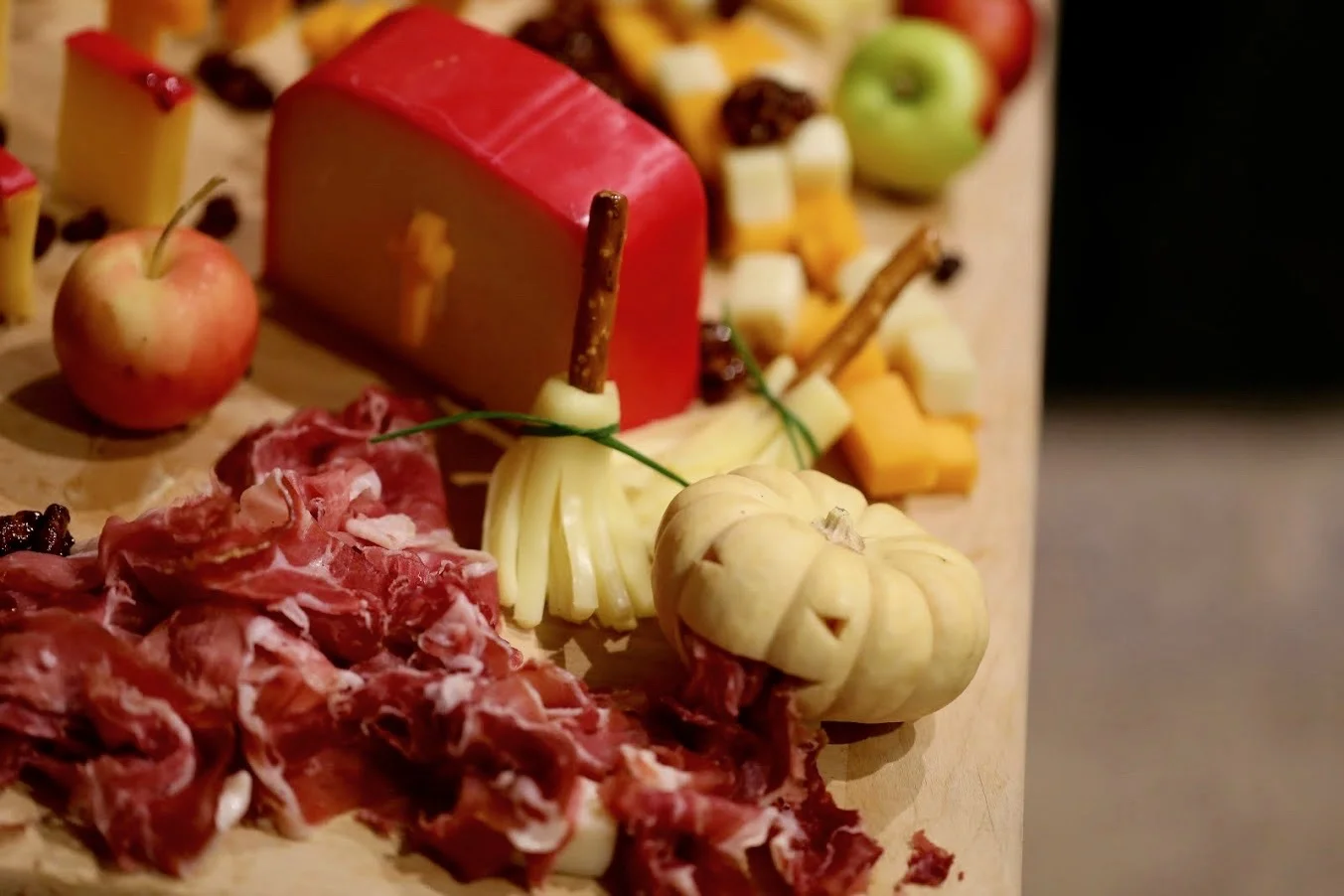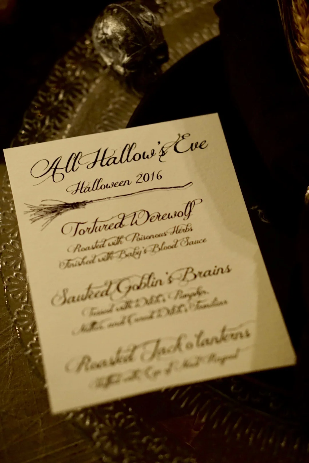 Menu. This is the part I love! Every year I make a three-course ghoulish dinner for my friends and feature bone-chilling food (or at least food with bone-chilling names haha!) – so, get creative! I print my menus in scary fonts on parchment paper, just to add to the effect. I’m also famous for my Cheese Graveyards, which I have a lot of fun with every year! Check some out here.