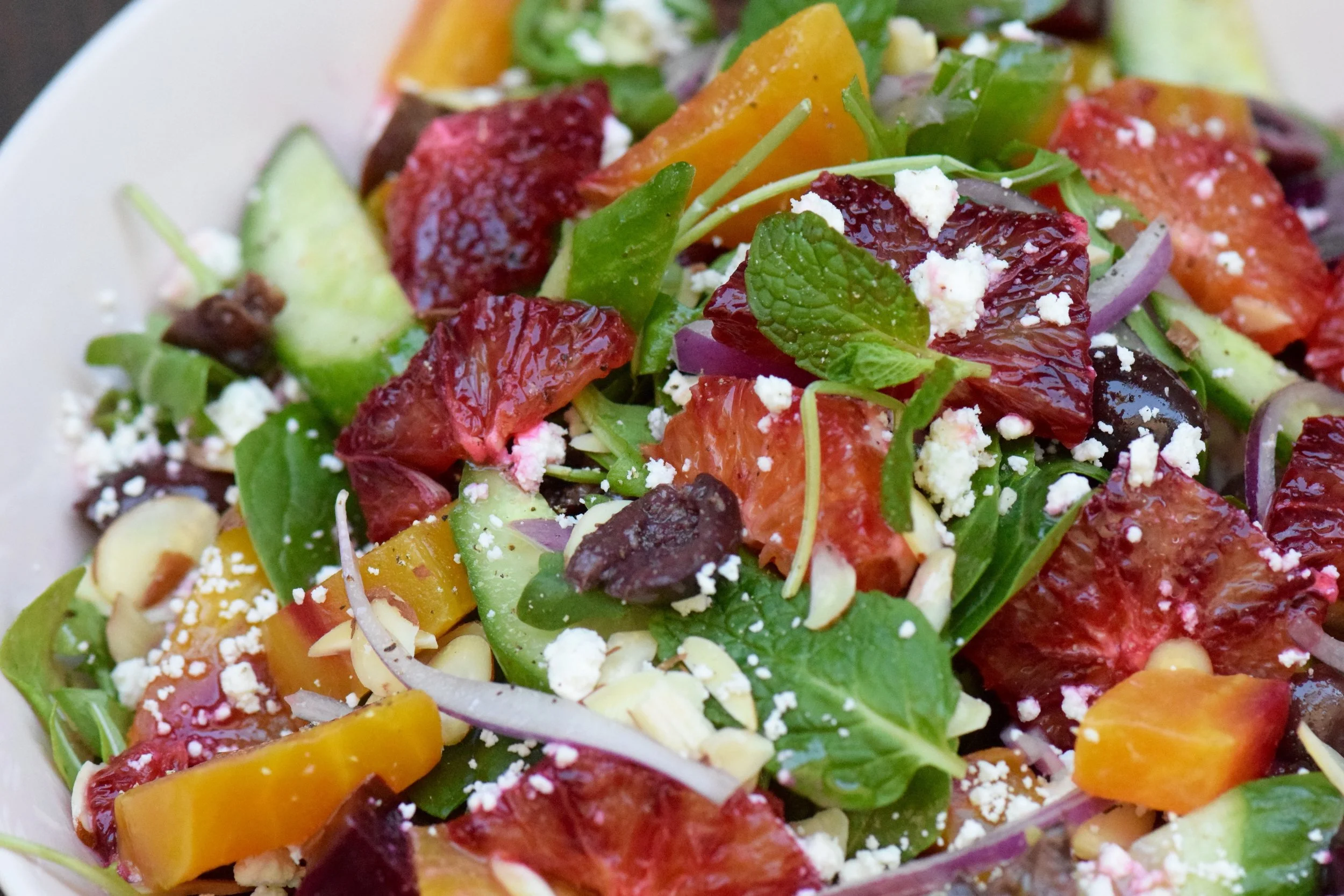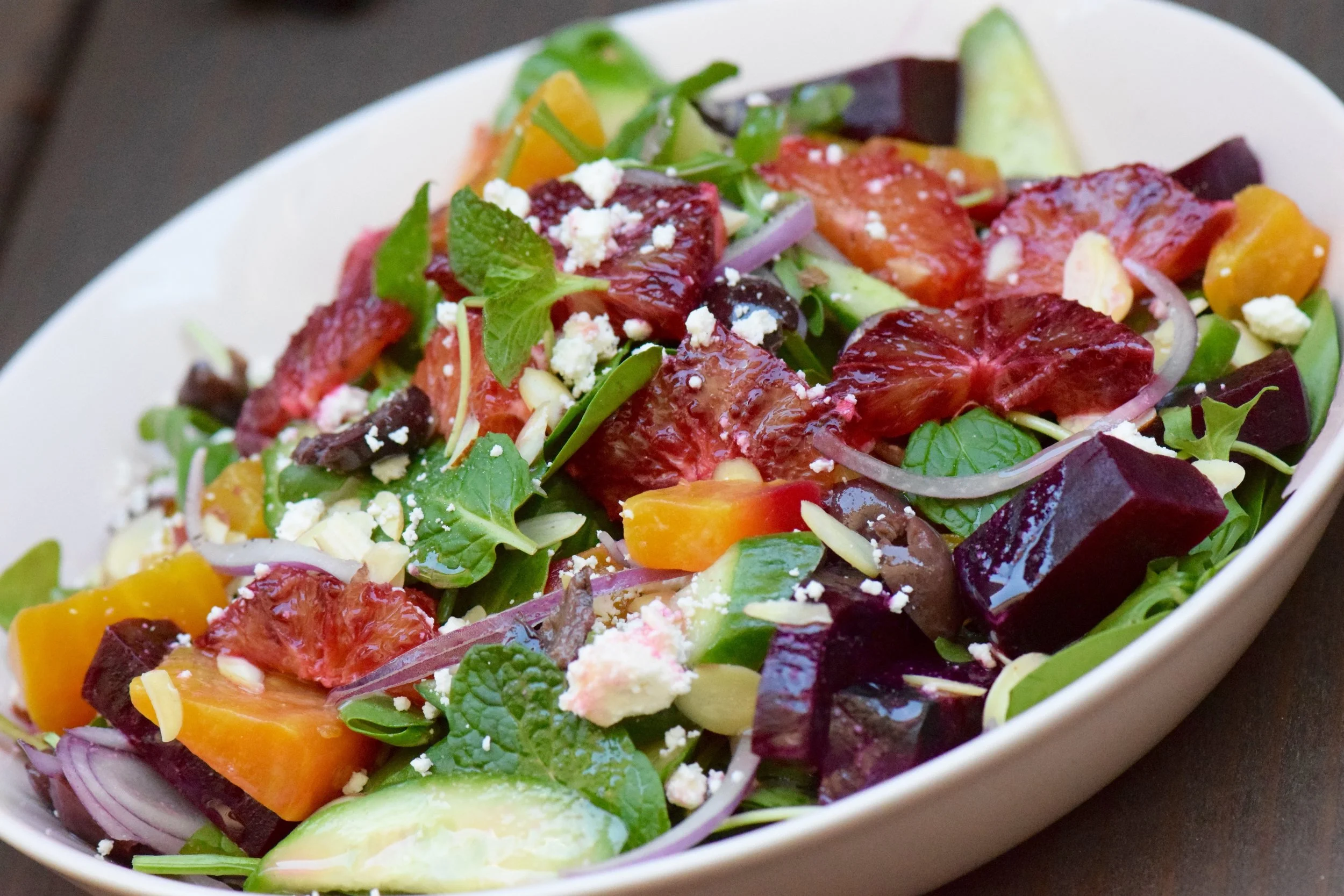 with Red & Golden Beets, Almonds, Feta, Red Onion, Cucumber, Black Olives, Mint and a Blood Orange Feta Vinaigrette