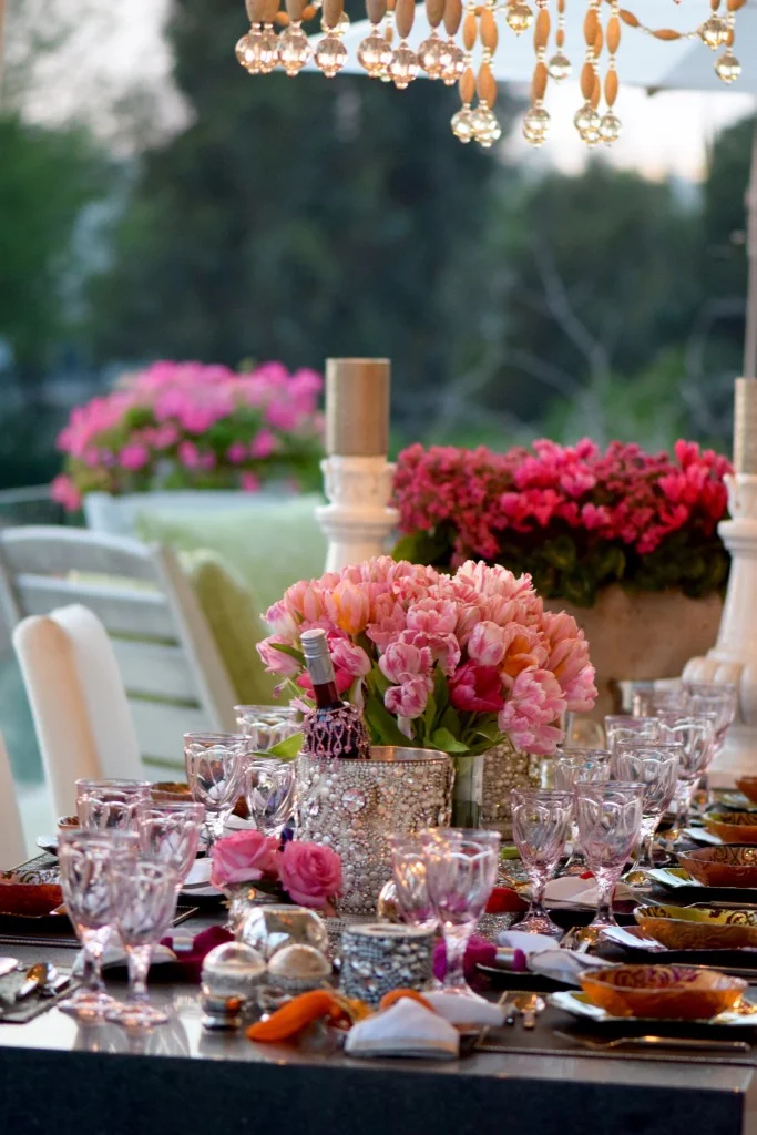 The more the merrier this summer. The combination of a relaxed and easy poolside meal with a decadent tabletop display makes for a really memorable experience! The easiest way to spoil your guests is with tabletops teaming with tasteful abundance. Jewel encrusted ice buckets, fabulous flowers, twinkling candles & outdoor chandeliers… this is the season to really go for it!